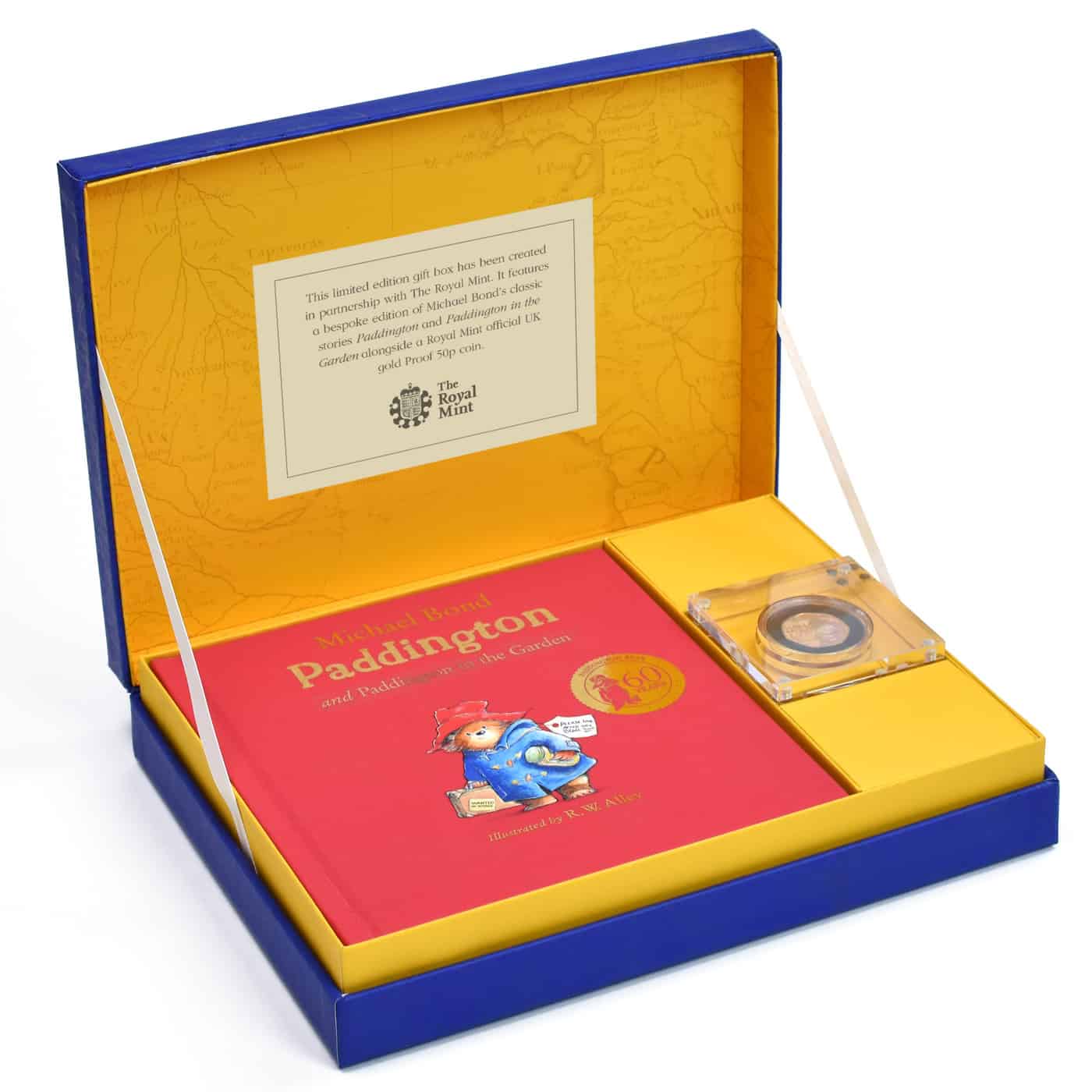 A 22ct rose-gold 50p coin and personalised story-book are presented together inside a premium gift box to celebrate the 60th anniversary of Paddington Bear. The book contains two stories about the lovable Peruvian bear, including the original tale of how he came to London and got his name. The coin is a 22ct rose-gold 50 pence piece, especially made by the Royal Mint for this occasion and of which only 600 have been produced. The book and coin sit snugly side by side inside the gift box, which is branded with the crest of the Royal Mint and a logo representing the 60th anniversary of Paddington Bear. The limited availability of this product makes it a superb collectable, as well as a fantastic gift for anybody who loves Paddington.