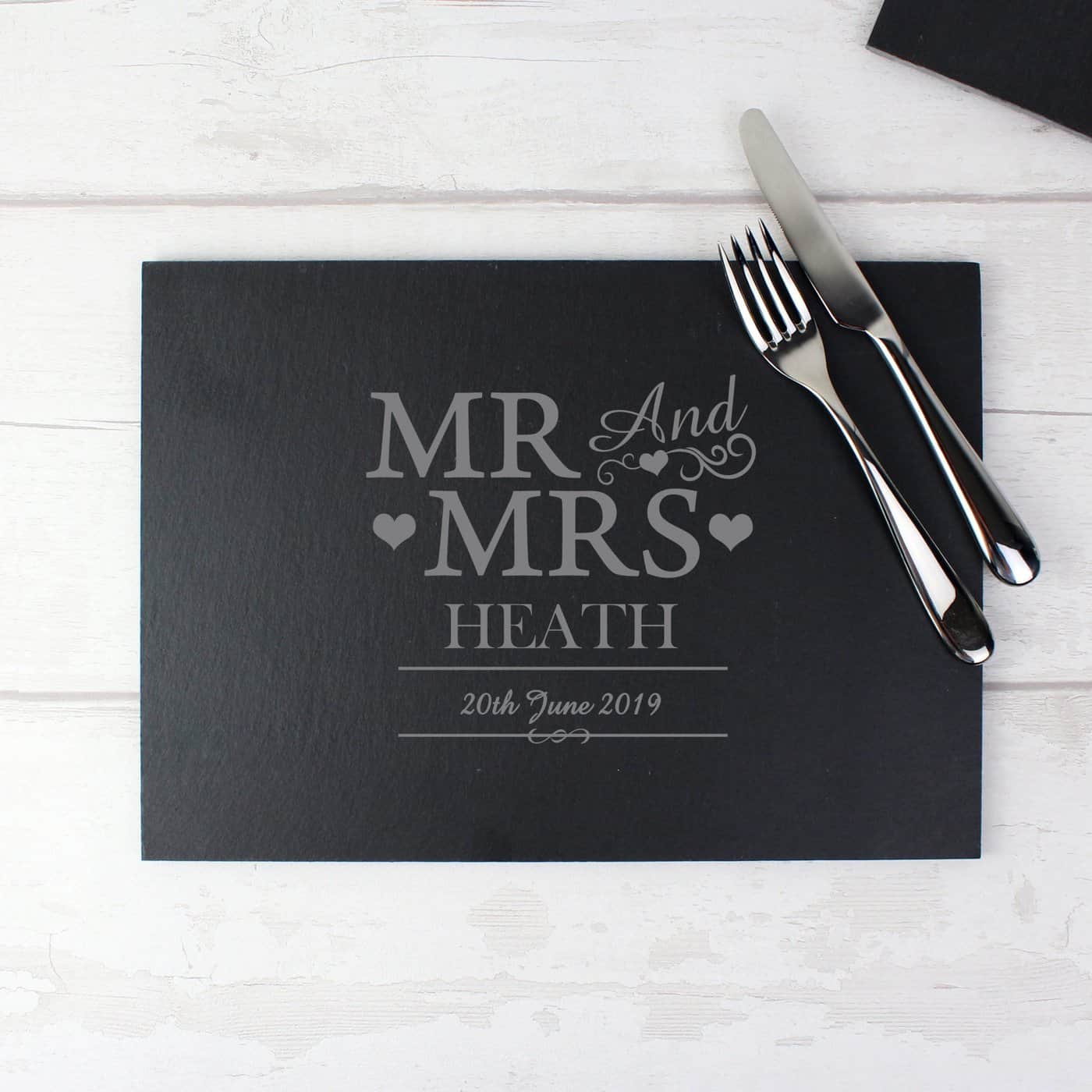Personalise this Mr & Mrs Slate Board with a couples surname up to 15 characters and date up to 20 characters.