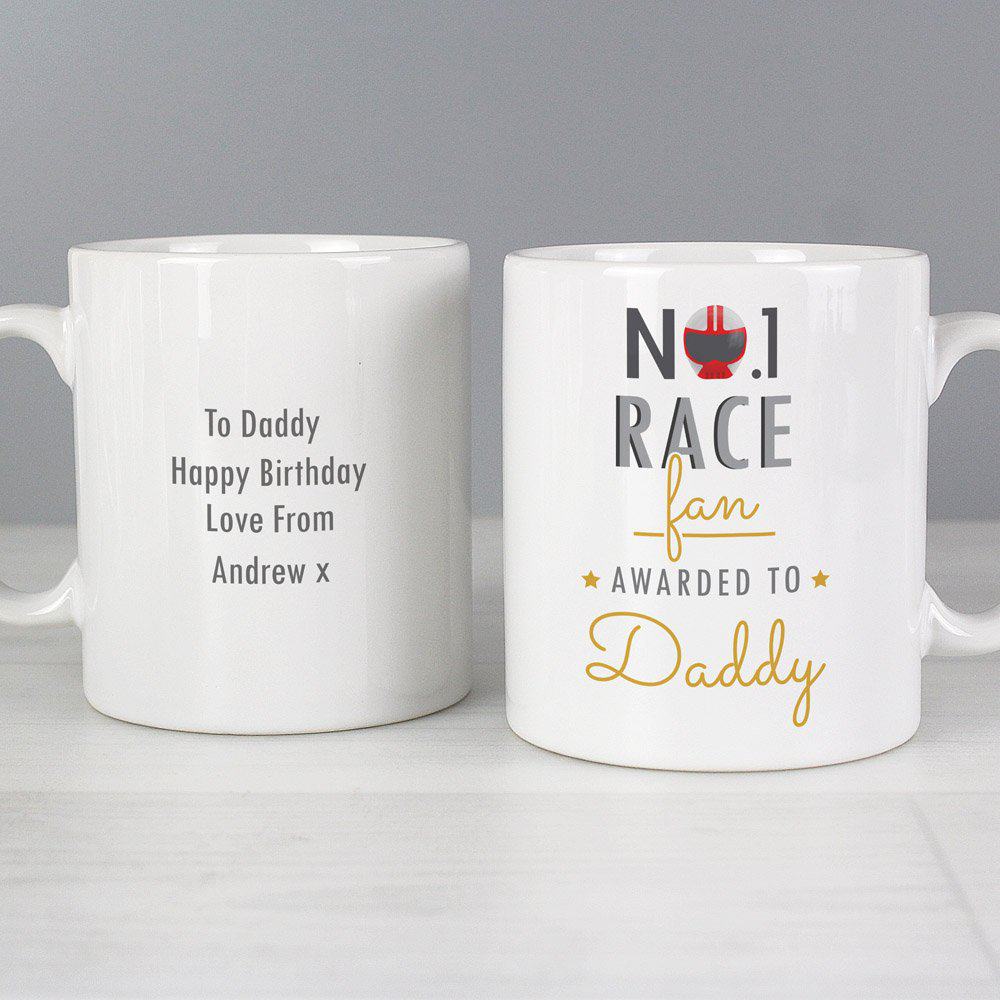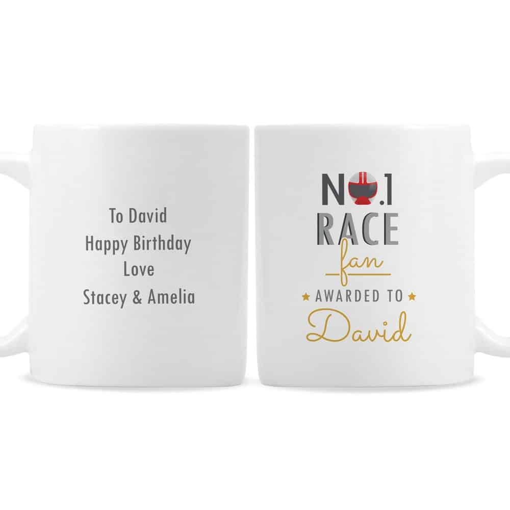 1 Race Fan Mug!The front of the mug can be personalised with a name up to 12 characters. The reverse of the mug can be personalised with 4 lines of text, with up to 20 characters per line. All text is case sensitive and will appear as entered. Please avoid entering your text in block capitals, as this may make the personalisation difficult to read. The text ‘No. 1 Race Fan’ and ‘Awarded to’ is fixed and cannot be amended. What’s more, this fantastic gift can also be made and despatched in 48 hours. Hand washing is recommended. Material is ceramic. Ideal for Father’s Day and Birthdays.