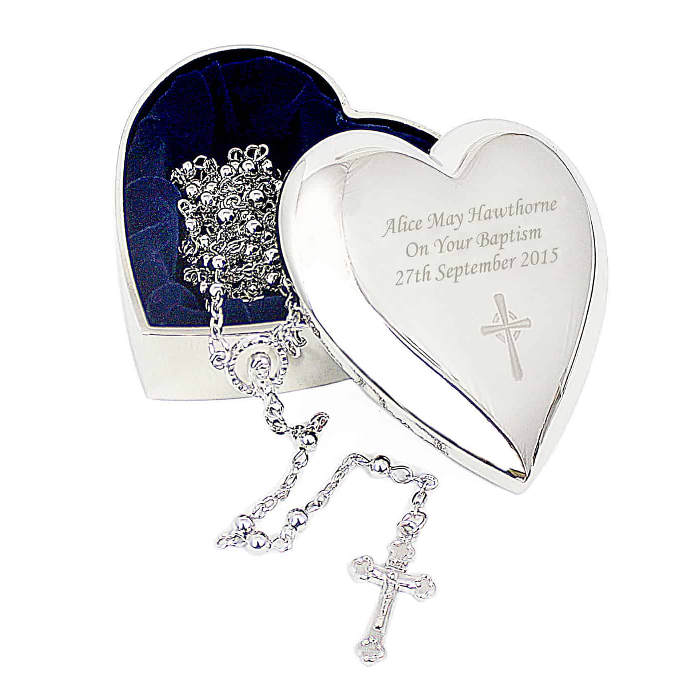 Personalise this Cross Motif Heart Trinket box with any message of up to 3 lines of 20 characters.