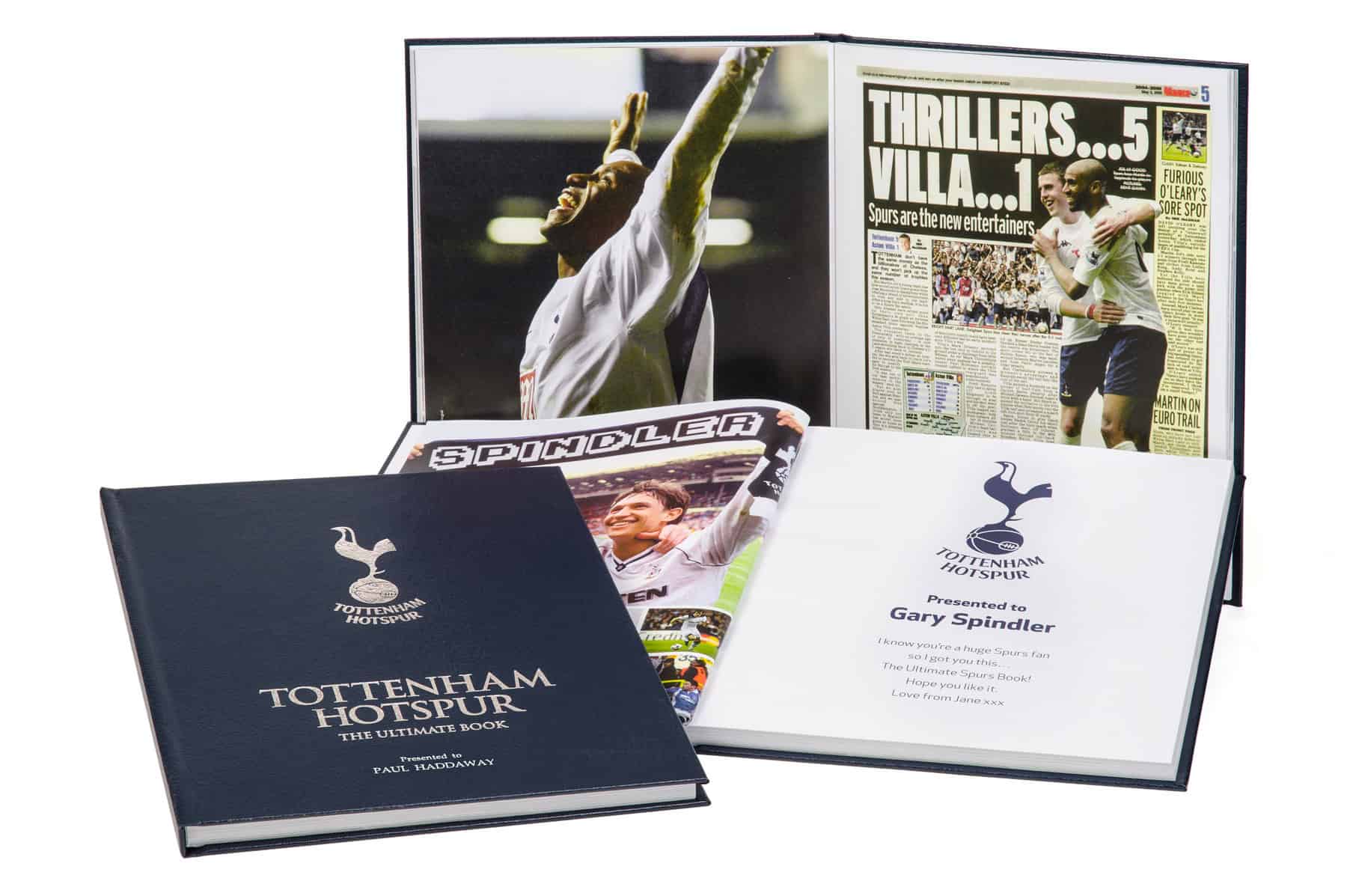 Tailor made for diehard Tottenham Hotspur fans, the officially licensed Tottenham Hotspur: The Ultimate Book takes “must have” to a whole new level. Split into three main eras – the early years, the post-war years and the Premiership years – it features 200 pages of newspaper coverage, iconic photos and captions that are used to create a comprehensive reportage history of the club. On top of that, there’s also a “Roll of Honour” and a number of pages dedicated to some of the club’s all-time legends, including Danny Blanchflower, Dave Mackay, Glenn Hoddle, Steve Perryman and Cliff Jones. Relive Tottenham Hotspur’s rich history. The famous League and Cup wins, memorable games and the stars – past and present – all through newspaper coverage, written by reporters who were present at the games, at the time. What also sets this book apart is the level of personalisation. Inside, you can include your chosen Name and a Message, the latter of which can be up to four lines of 30 characters each. And that’s not all. Your chosen Name will also be silver embossed on the front cover, while throughout the book the same Name will be seamlessly integrated into eight more timeless Tottenham Hotspur photographs. This stunning book is printed in full colour on to premium quality paper. Its cover, meanwhile, is a genuine leather hardback that measures in at an impressive 38 x 31cm. The Spurs logo and the recipient’s name is silver embossed on the front cover.