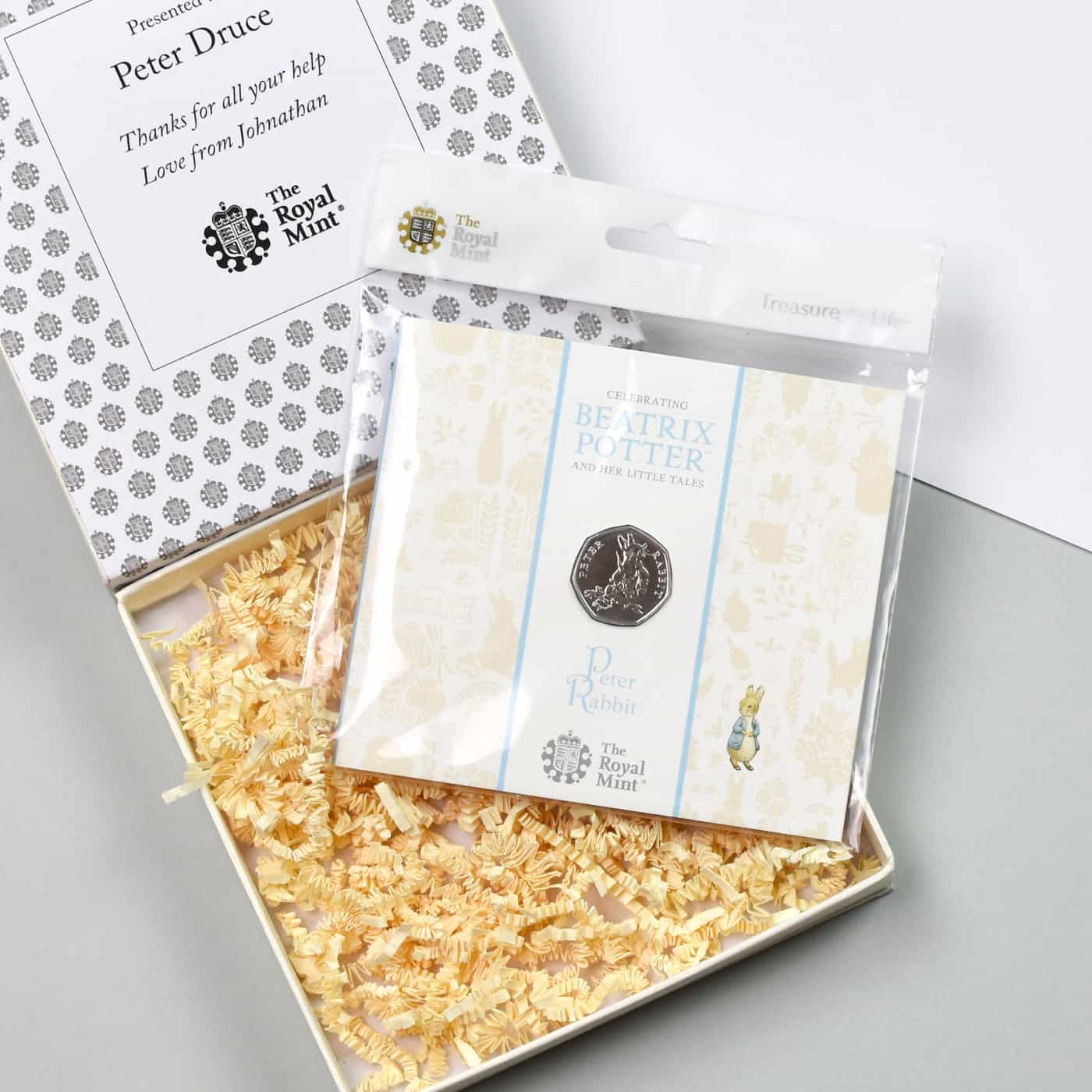 A keepsake personalised gift box that includes a special Peter Rabbit 50p coin.