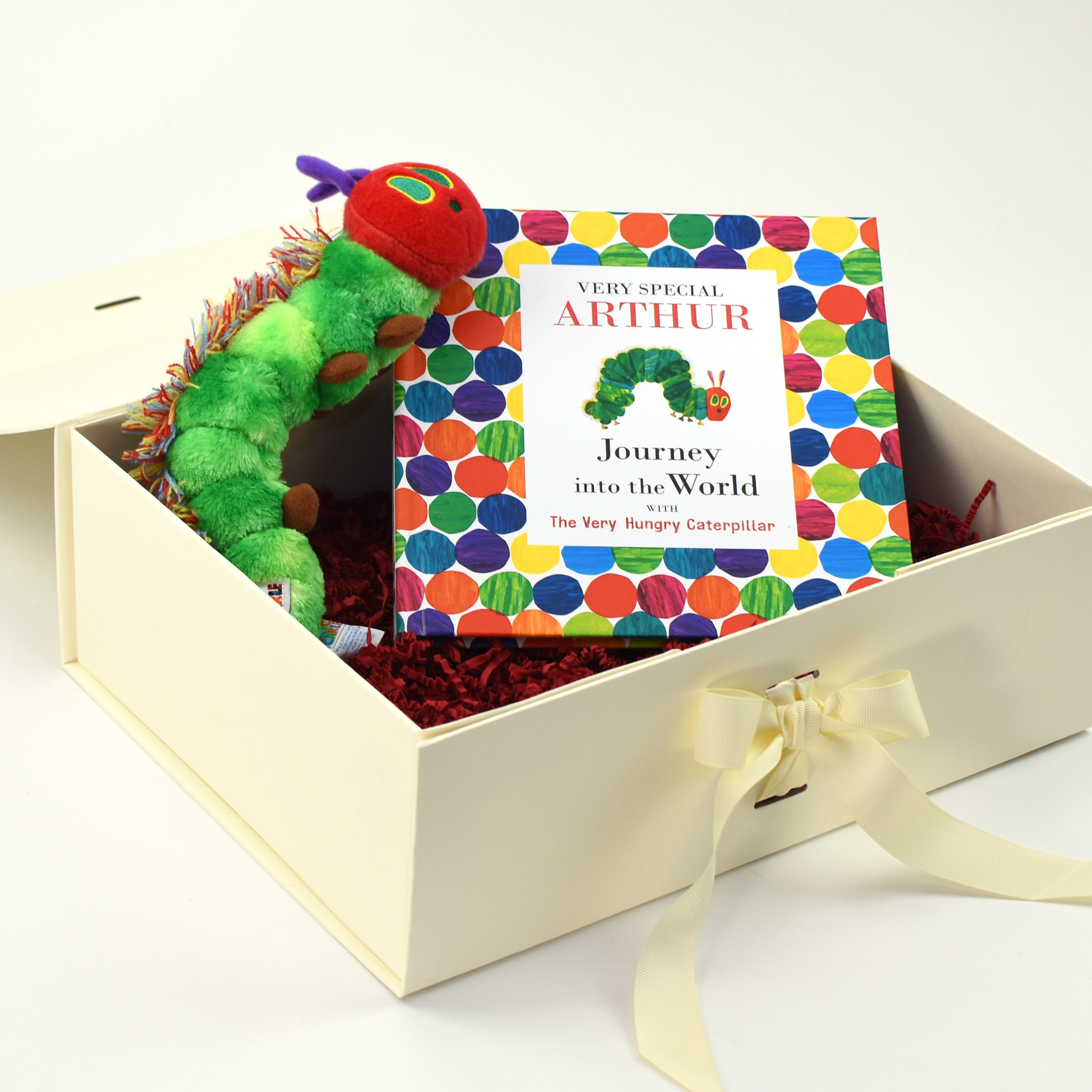 This personalised book will take your little one into the world of the Very Hungry Caterpillar, where bright, vivid illustrations and words of wisdom are the order of the day. With their name appearing throughout the story as well as on the front cover and opening page, the recipient of this special gift will want to read this book again and again. A personal message can also be added to the opening page. Alongside the book is an adorable Very Hungry Caterpillar plush toy, the perfect companion for those bedtime readings. This charming set is presented inside an ivory coloured, deep A4 gift box, making this a truly exceptional and memorable gift that will be treasured by its recipient for years to come.